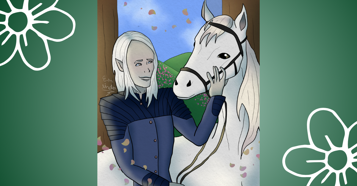 In celebration of spring, I drew this cheerful Xier and Benevolence. I’m proud of how Benevolence turned out, in particular. (Horses are a pain to draw.)